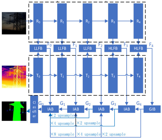 The above research on semantic segmentation is based on single-modal images. In recent years, scholars have begun to focus on semantic segmentation tasks based on multi-modal images, attempting to fully exploit feature information through the fusion of different modalities to improve the performance of semantic segmentation [22,23,24,25,26,27]. Infrared thermal imaging technology generates infrared images by sensing the thermal radiation of the target, so infrared images are not affected by changes in lighting. They are beneficial for detecting and segmenting targets under insufficient light conditions. However, the edges of infrared images are generally blurred without color texture information and clear details. Natural light images have rich details and texture information, but the imaging quality is easily affected by light illumination in outdoor scenes. The two modalities of images have a good complementary relationship, so some studies use the fusion of them to achieve more accurate semantic segmentation results. Ha et al. [22] proposed a multi-modal fusion network (MFNet) based on CNN architecture for semantic segmentation tasks across multi-modal image fusion. The overall structure of MFNet is an encoder–decoder structure consisting of two identical encoders that extract feature maps of natural light images and infrared thermal images, respectively, and one decoder. The proposal of MFNet indicates that the collaborative processing of infrared and natural light images can significantly improve the performance of semantic segmentation algorithms. Sun et al. [23] proposed a network called RTFNet which is designed by introducing a residual structure on the basis of MFNet. The RTFNet network used two of the same encoders to extract natural light and infrared image features and then fused features by summing up the elements one by one. However, most of the above methods used simple fusion strategies, which lead to insufficient fusion of multi-modal image information and could not fully utilize the specific features of different modalities. Sun et al. [24] proposed a FuseSeg network using DenseNet as the backbone encoder network. This network proposed a two-stage fusion strategy to achieve the fusion of different modalities of image features in order to fully utilize the complementary information between infrared and natural light images, and it reduced the loss of spatial information due to down-sampling. Zhou et al. [25] used the MobileNetV2 network to extract features from infrared and natural light images and a fusion strategy with an embedded control gate to segment urban scenes. Wang et al. [27] proposed a novel semantic-guided fusion network (SGFNet) for RGB–thermal semantic segmentation. The SGFNet consists of an asymmetric encoder with a TIR branch, an RGB branch and a decoder.