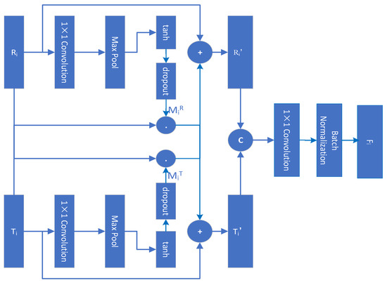 With the cross-modal spatial activation path of the spatial dimension, the lower-level natural light feature maps and infrared feature maps can mutually absorb complementary information from each other to benefit the spatial detail information for semantic segmentation. Meanwhile, the spatial attention mechanism helps the network to focus more on the spatial detail features of the target to be segmented, eliminating the interference of redundant information and background noise on semantic segmentation predictions. The enhanced natural light feature map R i and infrared feature map T i are fused by channel concatenation, then a 1 × 1 convolution layer is used to convert the fused feature maps to the same channel number as the input feature maps, and finally the maps are batch-normalized to attain the fused feature map F i .