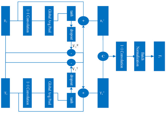 With this cross-modal activation approach along the channel dimension, higher-level natural light feature maps and infrared feature maps can fuse each other’s advanced semantic information. After that, a 1 × 1 convolution layer is used to convert the fused feature maps to the same channel number as the input feature maps, and finally the maps are batch-normalized to attain the fused feature map: