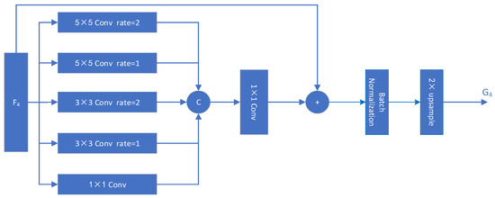The structure of the global information block is shown in Figure 4. The higher-level fusion feature map F 4 is firstly fed into a feature pyramid structure with five parallel branches to capture multi-scale global context information. The five parallel branches contain a 1 × 1 standard convolution layer for channel adjustment and 3 × 3 and 5 × 5 hole convolution layers with different dilation rates. Different expansion rates of hole convolutions can obtain feature maps with the same spatial resolution but different receptive field scales which contain high-level semantic information at different scales. The multi-scale feature maps obtained via convolution are fused through channel cascade operations, and then a 1 × 1 standard convolution layer is used for feature refinement and channel adjustment. Finally, the fused multi-scale feature map is fused with the original cross-modal fusion feature map F 4 through a skip connection structure, a batch-normalization operation and an up-sampling layer to obtain the final multi-scale fusion feature map G 4 . This parallel multi-scale feature pyramid structure is beneficial for exploring and enhancing the multi-scale context information of higher-level fusion feature maps, and the extracted multi-scale global context feature map G 4 serves as global semantic information to guide the fusion of feature maps at each stage.