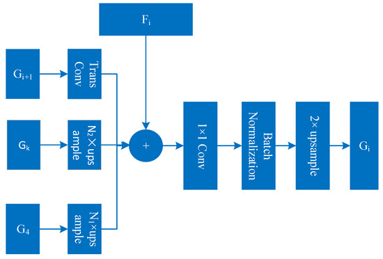 Figure 5 shows the structure of the proposed information aggregation block, which contains a 2 × 2 transposed convolution layer, a standard 1 × 1 convolution layer, a batch-normalization layer and an up-sampling layer. Multi-scale global contextual information G 4 , higher-level contextual information Gk (k > i + 1) and the feature map G i + 1 aggregated in the previous stage are up-sampled using bi-linear interpolation and recovered to the same resolution as the cross-modal fusion feature map F i using transposed convolution. Then, feature aggregation is performed by pixel-wise addition. The gradual addition of cross-modal fusion features and multi-scale global contextual information during each level of feature aggregation can effectively alleviate the problem of missing details and semantic information in the decoding process, which is beneficial for final semantic segmentation prediction. Finally, the aggregated feature maps are batch-normalized and up-sampled and sent to the classification prediction block for final semantic segmentation prediction, which consists of a 1 × 1 convolution layer and a softmax layer.