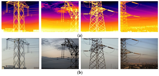 Figure 6. Image samples in the TTS200 dataset. (a) Infrared images of transmission pylons; (b) natural light images of transmission pylons.