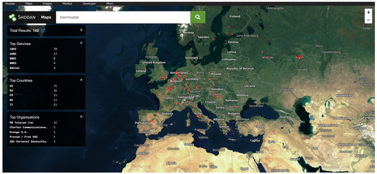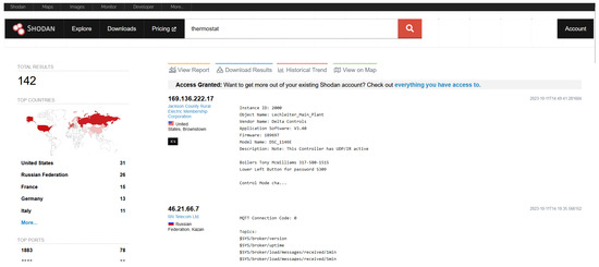 - Al-Alami, H.; Hadi, A.; Al-Bahadili, H. Vulnerability scanning of IoT devices in Jordan using Shodan. In Proceedings of the 2017 2nd International Conference on the Applications of Information Technology in Developing Renewable Energy Processes & Systems (IT-DREPS), Amman, Jordan, 6–7 December 2017; pp. 1–6. [Google Scholar] [CrossRef]