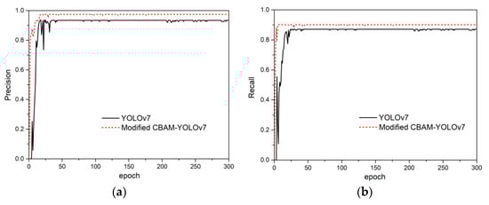 In the training process, the hyperparameters of the networks were fine-tuned as well. The default hyperparameters were used in the first training to establish a performance baseline. Then, the random search method was adopted to find the hyperparameters with better performance than the baseline. By doing so, the fine-tuned neural network and desired precision, recall and mAP values are achieved. The above comparisons show that the modified YOLOv7 can obtain a great performance improvement in the training. These results are consistent with the fact that modules, like CBAM and FPN in references [,,], are effective in improving the performance of neural network models.