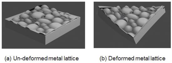 (a) The sensor’s metal lattice before thermal stresses; (b) the sensor’s metal lattice deformed by the thermal stresses. Metal grains are displaced with respect to the original placement, causing hysteresis in the measurements.