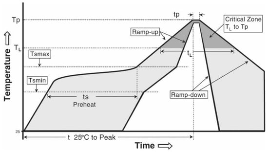 Figure 2 represents the temperature with respect to time according to the IPC/JEDEC J-STD-020C Standard [18]. It represents the different stages during the soldering process. Each of these stages has a specific thermal profile designed to achieve optimal soldering results while safeguarding the components from overheating.