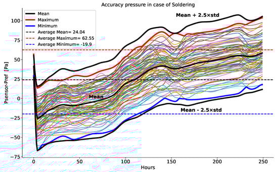 Pressure data were collected from 80 LSP22HH sensors, sampled randomly from several production batches. They underwent the soldering type of thermal stress, compliant with the IPC/JEDEC J-STD-020C Standard [18]. These measurements were collected for 246.5 h after the soldering process was completed, in ambient temperature conditions. The reference barometer measurements were subtracted from the sensor measurements (Psensor − Pref), to derive the accuracy pressure curves plotted in Figure 3.