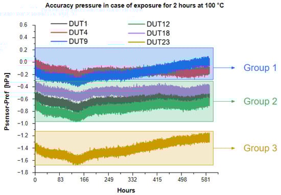 Accuracy pressure for dataset B: prolonged exposure (2 h) to moderately high temperatures (100 °C). The data acquisition took 596 h (approximately 25 days), after the thermal stress was completed. The data belonged to six DUTs that were classified into three main groups based on the standard deviations of the measures at their outputs, and then augmented in order to compile three different datasets.