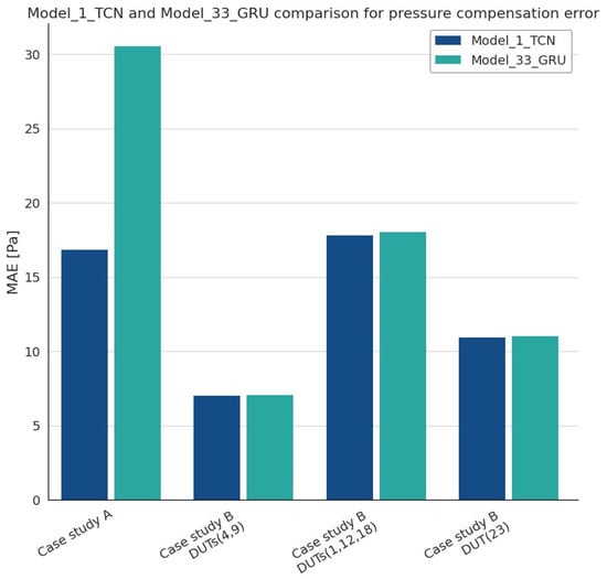 Figure 5 shows clearly that, for case A, model_1_TCN outperforms model_33_GRU, achieving a lower MAE of 16.85 Pa. In contrast, model_33_GRU exhibits a higher degree of error, with an MAE of 30.54 Pa. This discrepancy underscores the superior accuracy of model_1_TCN in the challenging post-soldering scenario, emphasizing its efficacy in handling drifts introduced by soldering processes.
