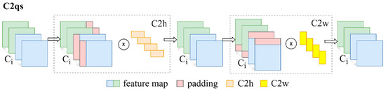 In order to save computing resources, the C2qs convolution is designed. The detailed steps of C2qs are as follows. First, the standard 2 × 2 convolution kernel (C2) is channel separated in the horizontal and vertical directions, respectively, and the height convolution C2h (1 × 2) and width convolution C2w (2 × 1) are obtained. Then, a new symmetric padding strategy is used to alleviate the information shift problem.