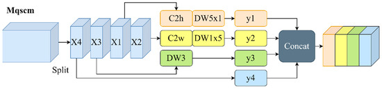 Due to the inadequacy of C2qs in effectively balancing the tradeoff between network accuracy and speed, this paper presents further enhancements to C2qs and, ultimately, proposes a solution. The workflow of Mqscm is depicted in Figure 2. Its architecture shares similarities with group convolution and inception; however, the convolution kernels corresponding to each group in Mqscm are different. This distinction arises from the optimization of images with varying information distribution. Specifically, larger convolution kernels are favored for images with a more uniform information distribution, whereas images with a more localized information distribution prefer smaller convolution kernels. Mqscm employs convolution kernels of varying sizes to extract information across multiple scales, thereby ensuring network performance.