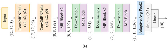 The MqscmNet network architecture designed in this paper is improved, based on the non-bottleneck architecture ResNet-50 [13], and the network structure is shown in Figure 3a. It does not use any additional gain mechanism (such as an attention mechanism), but simply performs convolution replacement and model architecture simplification operations; the network can also obtain better efficiency tradeoff.