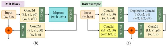 The overall structure of MqscmNet: (a) MqscmNet structure; (b) Mqscm residual block; (c) downsampling module.