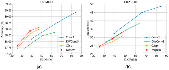 Table 1 shows the classification results of Mqscm, Conv3, DWConv3, and C2sp convolution on the CIFAR-10 dataset. In this paper, the metrics compared were computing complexity (FLOPs), parameter size (Params), accuracy, and average training time per epoch (Time/Epoch). Ranked by computational complexity, Conv3 > C2sp > DWConv3 > Mqscm. Ranked by accuracy, Conv3 > Mqscm > DWConv3 > C2sp. Ranked by speed, DWConv3 > Mqscm > C2sp > Conv3. The standard convolution Conv3 had, undoubtedly, the highest accuracy, but it had the largest computational complexity, the largest number of parameters, and the longest training time. DWConv3 was the fastest and achieved a good efficiency tradeoff, but the computational complexity and accuracy were slightly lower than those of Mqscm. C2sp performed well but was weaker than Mqscm in all aspects. This is attributed to the heightened sensitivity of standard convolution to the complex feature information in images and its robust representation capability. However, the simultaneous consideration of channels and regions contributed to increased computing and memory requirements, thereby impacting the efficiency of network training. Conversely, DWConv3 and Mqscm effectively reduced the number of parameters and enhanced training speed through distinct separation methods. Nevertheless, there was a tradeoff, as they occasionally lost some global information, leading to a slight decrease in accuracy. Compared with Conv3, Mqscm saved about 44.5% of the calculated amount and accelerated the model training by about 32.5%. The comprehensive performance of Mqscm was comparable to that of DWConv3.