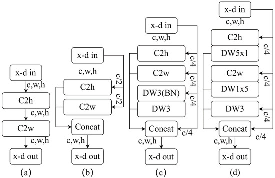 In an ideal scenario where the input and output tensors maintain the same size, under the assumption that the number of channels () is divisible by 4, Mqscm divides the learnable channel into four groups, resulting in four separated input groups . Each group is assigned distinct convolution kernels, namely (C2h + DW5 × 1, C2w + DW1 × 5, DW3, 0), where DW (1 × 5, 5 × 1) represents the quadratic separation convolution. This convolution operation first separates the 5 × 5 convolution by channel and then by space, forming isomerism with C2h and C2w, respectively. The goal is to reduce information redundancy in the network space, capture both horizontal and vertical information, and attain a larger receptive field. undergoes a 3 × 3 depthwise convolution to extract feature information in other directions, such as the diagonal. undergoes no operations and is directly passed to to supplement detailed information of certain global features. Finally, the output results of each branch are concatenated.