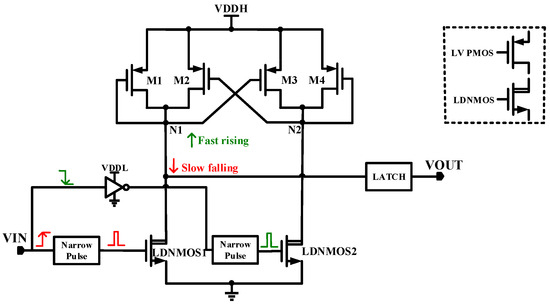 Figure 4 shows another type of conventional level shifter [17]. This topology clamps the voltage at nodes N1 and N2 to VDDH − VGS by using the diode-connected low-voltage PMOS transistors M1 and M4, where VGS is the gate-source voltage of the PMOS transistors. When the input signal VIN switches from low to high, the high-voltage tube LDNMOS1 is turned on; then the potential of the N1 point is pulled down, and the potential of the N2 point rises. However, the potential at point N1 decreases more slowly than the potential at point N2 rises due to the current asymmetry. In the same way, when the VIN switches from high to low, the high-voltage tube LDNMOS2 is turned on; then the potential of the N2 point is pulled down, and the potential of the N1 point rises. The falling speed of the potential at point N2 is slower than the rising speed at point N1. For the structure in Figure 4, only a pair of high-voltage transistors, LDNMOS1 and LDNMOS2, are used, which has a lower parasitic capacitance than the structure in Figure 3. However, this level shifter faces the same difficulties as the structure shown in Figure 3, namely, that there is a severe mismatch delay and low dV/dt noise immunity.