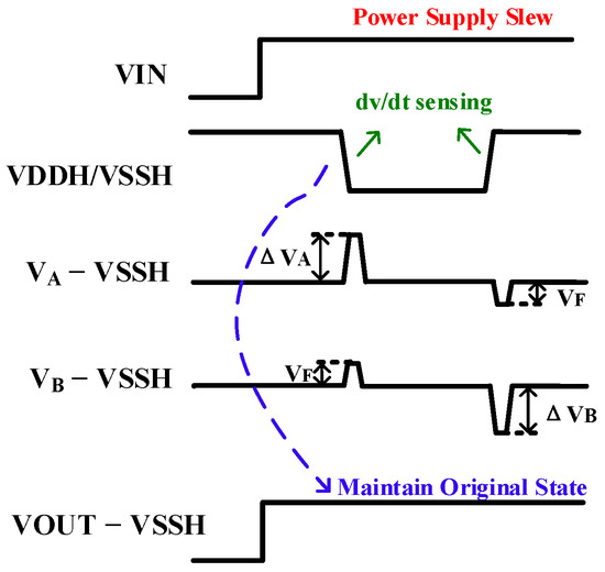 The problem of dV/dt immunity is the most important concern of the level shifter, which can be analyzed from the two situations of positive swing and negative swing of the power supply. As shown in Figure 6, when the VIN is high, the normal states of VA − VSSH and VB − VSSH are low voltage and high voltage, respectively. When VSSH and VDDH quickly transition from high voltage to low voltage, both VA − VSSH and VB − VSSH rise to high voltage. When VSSH and VDDH transition from low voltage to high voltage, both VA − VSSH and VB − VSSH can drop to low voltage. Therefore, the dV/dt Noise Shielding Circuit is meant to maintain the level shifter’s output in order to avoid the succeeding stage circuit from receiving the erroneous signal output of the level shifter.