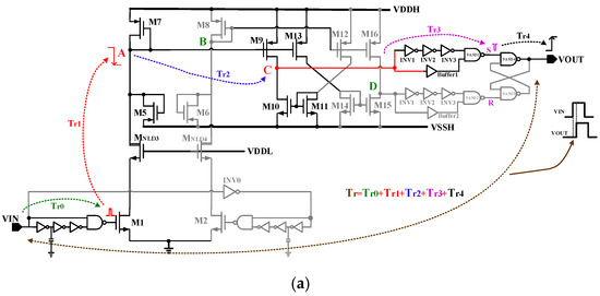 The proposed level shifter’s operation for switching from low to high is shown in Figure 8a. Before the VIN becomes high, VA is equal to VDDH, and VB is equal to VSSH. The signal transmission process of the level shifter is as follows:
