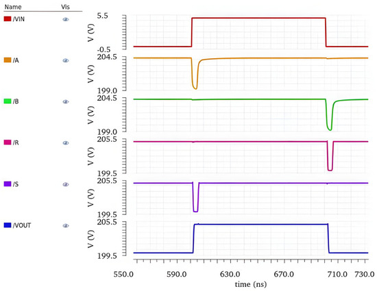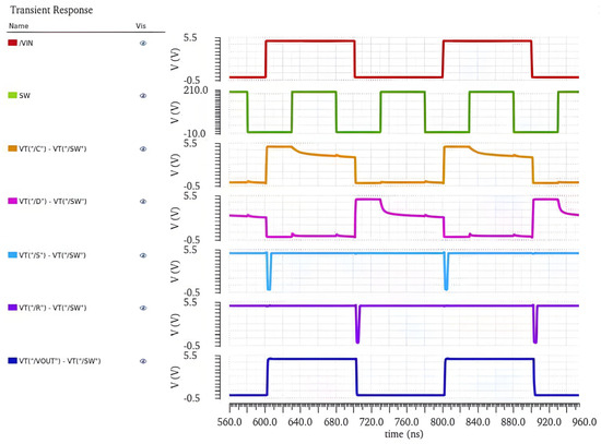 The transient operation of the proposed level shifter is demonstrated with low-to-high and high-to-low operations. When the VIN shifts from low to high, M1 is activated and M2 is turned off. The voltage at node A starts declining, the dropping edge of node A is sampled, and the rise of node C is accelerated by the current comparison circuit. The rising edge of node C is delayed by the delay circuit composed of the inverters INV1–INV3, and then the delayed signal is input to NAND1 together with the signal of node C. Next, a low-voltage pulse signal S is generated, and then the voltage of the VOUT changes from low to high. When the input signal VIN changes from high to low, M2 is turned on, and M1 is turned off. The voltage at node B begins to drop, and then the falling edge of node B is sampled, which speeds up the rising speed of node D. The rising edge of node D can be delayed by the inverters INV4–INV6 and this delayed waveform is input into NAND2 with node D. At this time, a low-level pulse is generated in R to make the VOUT change from high to low. Figure 9 shows the waveform of the level shifter during the VIN transient changes.