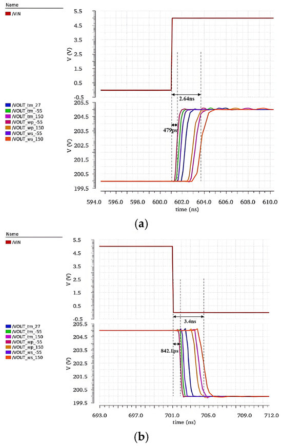 Figure 11a,b show the rising and falling delays of the proposed level shifter under three process corners, ss (Worst Case), tt (Typical Case), and ff (Best Case), at temperatures −55 °C and 150 °C. The simulation results show that the minimum rising delay is 479 ps and the maximum is 2.64 ns; the minimum falling delay is 842.1 ps and the maximum is 3.4 ns.