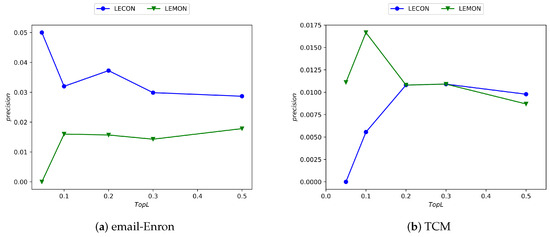 As depicted in Figure 7, the horizontal axis corresponds to the percentage of top-L-ranked edges by precision score, while the vertical axis indicates the precision value. It is evident from the figure that the LECON algorithm exhibits improved performance across nearly all datasets compared with the LEMON algorithm, despite the reduction in time complexity.