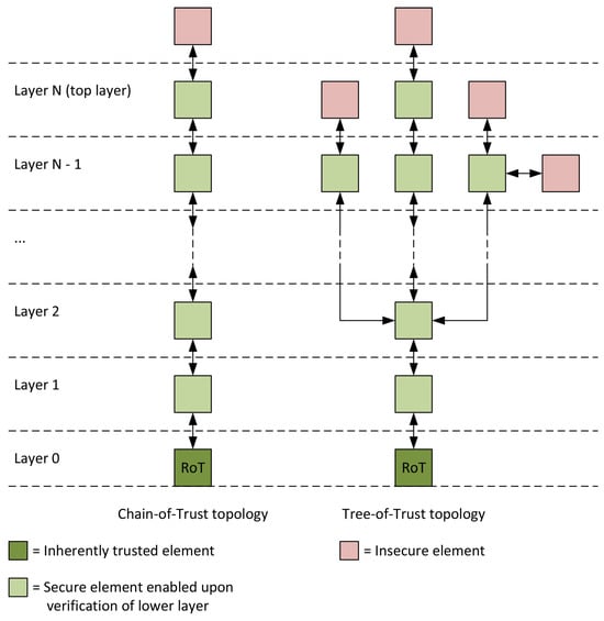 The RoT is the key element for building Trusted Execution Environments, typically through secure boot routines. In this sense, a TEE can be seen as a layered structure in which each layer is enabled (and configured) upon verification of the previous layer. The resulting environment constitutes a secure zone where code and data can be executed and processed securely. Each layer provides specialized security mechanisms that rely on the ones of the lower layer and support the higher layer. In case of an attack on any of the elements of a layer, the corresponding layer can attempt to counter the attack with its security mechanisms, and, in case of failure, that layer can be isolated by leveraging the lower layer. The highest layer of the security chain is the one connected with the main operating system, other parts of the processor, and eventually external systems, which are insecure. In some cases, not only can the highest layer be interfaced with insecure elements or zones, but also lower layers can, for instance, to provide advanced specialized services. In the former case, the TEE can be modeled as a Chain-of-Trust (CoT), i.e., the organization of the layers is purely sequential; in the latter case, the TEE can be modeled as a Tree-of-Trust (ToT), i.e., some layers concur with each other. A representation of the two different topologies is given in Figure 1.