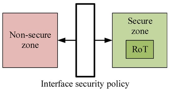 According to how much was highlighted by the review of the state of the art (Section 3), each of the proposed Trusted Environments relies on different and multiple components such as microcontrollers, OTPs, and coprocessors. As each of these elements is involved in the construction and maintenance of the TEE, each of them must offer an adequate level of security and adequate characteristics to carry out such purposes. Any flaw or vulnerability in any of the elements involved in these processes can severely compromise the security of the whole TEE. From a security point of view, any system integrating or adopting a Trusted Environment can be modeled as illustrated in Figure 2, by separating the security-related functions resources (Secure zone, green box) and non-secure-related resources (Non-secure zone, red box). The block that connects the zones is the representation of all the mechanisms through which the two zones can interact. It must integrate robust security policies that define how the assets of the secure zone may be accessed. For instance, it must regulate the content and the transfer methods of data from one zone to the other one and vice versa.