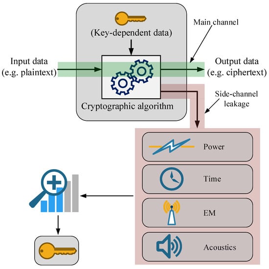 Scheme of operations of SCAs. By analyzing the leakage of information emitted through a side channel such as power, time, Electromagnetic Emissions (EM), or acoustics, an adversary is able to retrieve the secret key.