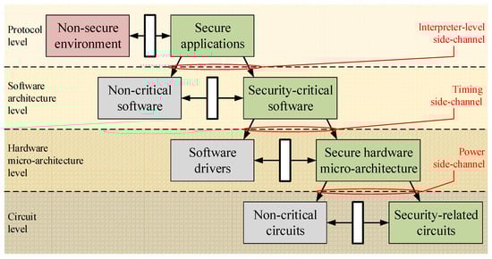 According to the key aspects to be addressed for the development of a secure module, the security partitioning model illustrated in Figure 2 should be applied recursively to each layer and to each element of the chain involved in the construction of the TEE by dividing it into both trusted and non-trusted components. The results of this approach converge in the definition of a more accurate partitioning model that is represented in Figure 4. Such a model counts four abstraction layers that are, respectively from the top to the bottom, the protocol level, the software architecture level, the hardware micro-architecture level, and the circuit level. Each of these levels is characterized by the separation between security-related and non-security-related resources and a specific interface security policy between them. In addition, the interconnection between each level and the higher one is characterized by a specific class of SCA. Respectively, from the top to the bottom, they are interpreter-level attacks (such as fault attacks), timing analysis and cache attacks, and power analysis attacks (such as SPA, DPA, and CPA).