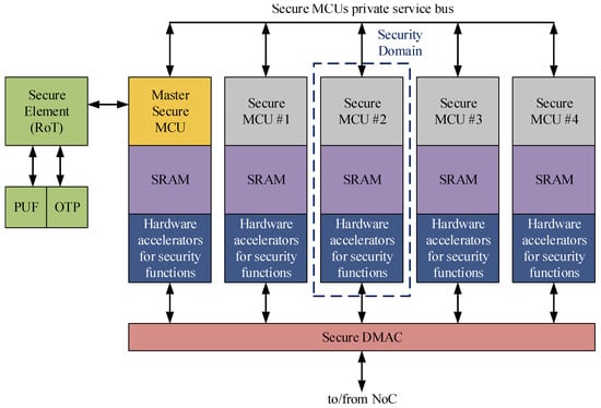 Our research group was involved in the development of the cryptographic hardware coprocessor (the blue box in Figure 6) that has the purpose of assisting the secure boot routine for enabling the Security Subsystem and providing high-performance security mechanisms [20]. The implemented module was named Crypto-Tile and offers cutting-edge security services [14]. According to the presented design methodology in Section 5.1, Section 5.2 and Section 5.3, we described the features integrated within the developed security module, respectively, at the security service level, interface security policy level, and physical implementation level.
