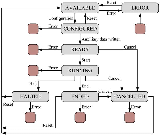 At the Global Crypto-Tile level, we integrated seal/unseal mechanisms that rely on a unique identifier that is configured during the secure boot process and the support of two authorization levels for access to the Crypto-Tile: a privileged level and an unprivileged level. For the cryptographic operation level, we integrated dedicated resources that strictly regulate the execution of each cryptographic operation and the access to the related data. For instance, Figure 8 shows the state diagram of the FSM that handles the cryptographic operations for the AES cryptoprocessor and manages access to the processed data. The auxiliary data such as initialization vectors can be provided in input only in the CONFIGURED state, while the input data to be encrypted can be written only in the RUNNING state, only once and only after the encryption of the previous data block is completed. In addition, the corresponding output data can be read only once and only in the RUNNING or ENDED state depending on the executed cryptographic operation. Similarly, the commands that can be provided to the AES cryptoprocessor strictly rely on the current state of the FSM.