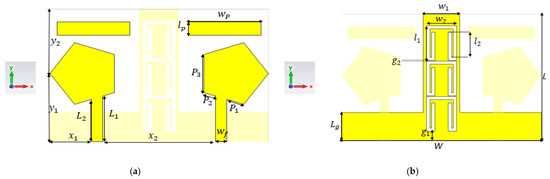The printed geometry of the proposed monopole-based MIMO antenna and the design parameters are illustrated in Figure 1. The final geometrical design parameters are given in Table 1. This antenna consists of two 50 Ω microstrip-fed pentagonal radiators associated with two rectangular parasitic elements placed symmetrically on the substrate. A standard 1.6 mm thick FR4 dielectric substrate with a 4.3 relative dielectric constant and a 0.025 loss tangent is used. Three CSRR slot structures are etched into the middle of the L-shaped defective ground plane for bandwidth enhancement and coupling reduction. The proposed design has a compact overall size of 30 × 20 × 1.6 mm3.