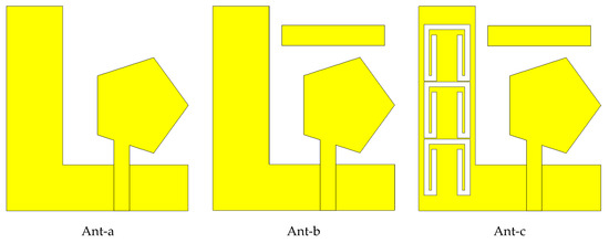 Initially, a compact single-element monopole antenna achieving the FCC frequency band requirements was designed to form the MIMO antenna. The strategy adopted, illustrated in Figure 2, was as follows: a pentagonal patch monopole antenna was designed on a low-cost FR4 substrate with an L-shaped defective ground plane (Ant-a).