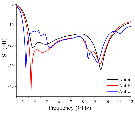 As shown in Figure 3, illustrating the reflection coefficient S11, this antenna operates in an ultra-wide frequency band under −10 dB, extending from 3.4 GHz to 11.39 GHz. To expand the lower frequency band and to improve the impedance matching, a rectangular parasitic element is added (Ant-b). According to the S11 plot in Figure 3, the lower bandwidth limit is shifted to 3.3 GHz. This slight improvement in the lower frequency band is supplemented by a more significant improvement in the impedance matching. In the last configuration, Ant-c, the ground plane is loaded by three CSRR cells. A more significant bandwidth enhancement is achieved in this case, ranging from 3.01 GHz to 12.34 GHz, covering the total FCC bandwidth allocated to UWB applications.
