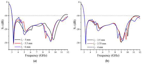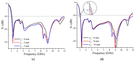 A parametric analysis was conducted to highlight the effects of the CSRR structure lengths (Figure 4a,b) and the parasitic-element length and width (Figure 4c,d) on the antenna bandwidth and impedance matching.