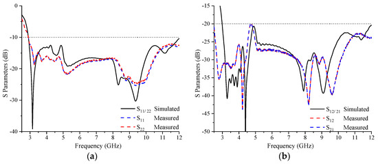 Simulated and measured results of S parameters: (a) S11 and S22, and (b) S12 and S21.