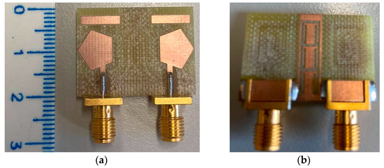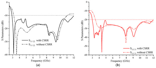 To highlight the effect of the introduction of CSRR structures in bandwidth enhancement and mutual-coupling reduction, the simulated reflection coefficients S11 and S22 and the coupling coefficients S12 and S12 are plotted for both cases (with and without the introduction of CSRR structures) in Figure 8a,b.