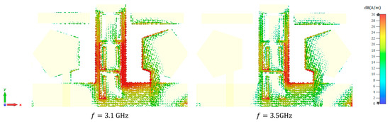 For the overall frequency bandwidth, the MIMO antenna with CSRR structures presents greater isolation than the MIMO antenna without CSRRs, except at 5 GHZ. This is confirmed by the current distributions, illustrated in Figure 9, plotted for the frequencies 3.1, 3.5, 5, and 8.5 GHz.