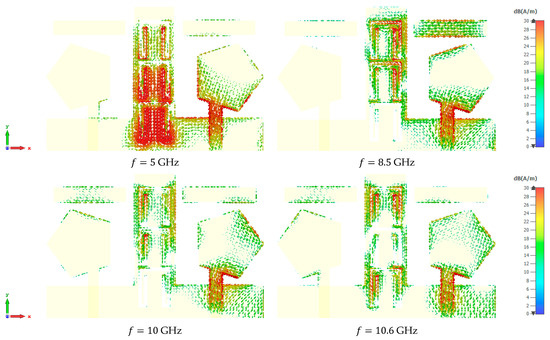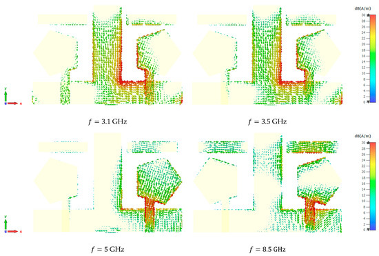 The surface current distribution is simulated by exciting Port1 while Port2 is terminated with a 50 Ω load. The obtained surface current distributions for 3.1 GHz, 3.5 GHz, 5 GHz, 8.5 GHz, 10 GHz, and 10.6 GHz are illustrated in Figure 7. These frequencies were chosen to highlight the radiation and isolation mechanisms. For low frequencies, the maximum current distribution is observed in the first two CSRR structures, the part of the defected ground located between the CSRRs and the radiating element, as well as the edges of the radiator located at the sides of the CSRR structures.