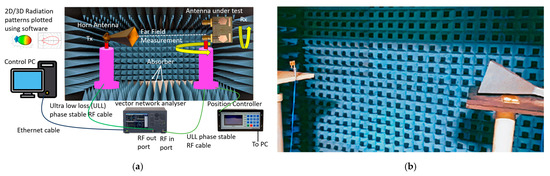 The setup for measuring the radiation pattern is shown in Figure 10. Figure 10a shows the block diagram of this setup, while Figure 10b shows the layout inside an anechoic chamber. In this scheme, the horn antenna acts as the transmitter, while the design under test (AUT) functions as the receiver. Both antennas are connected to the VNA, which provides the necessary power to the horn and collects power from the AUT. The resulting data are then fed to the software, which generates the corresponding radiation pattern.
