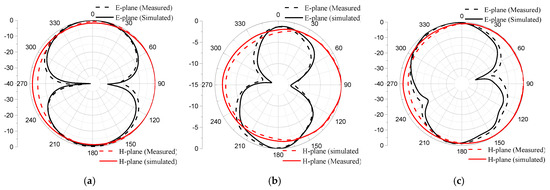 Radiation patterns of the proposed UWB-MIMO antenna at (a) 3.1 GHz, (b) 7.5 GHz, and (c) 10.6 GHz.