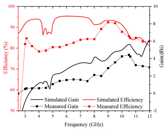 Figure 12 depicts the simulated and measured results for the peak gain and radiation efficiency of the UWB-MIMO antenna. The peak gain exhibits a range of from −1 dBi to 6 dBi, and the efficiency ranges from 77.3% to 95.3%, within the desired FCC UWB frequency range. The simulation was carried out without introducing the SMA connector; this is the cause of the differences observed between the simulations and measurements. The introduction of this port into the manufactured prototype caused additional ohmic losses, leading to the reduction in the antenna efficiency and, consequently, its gain.
