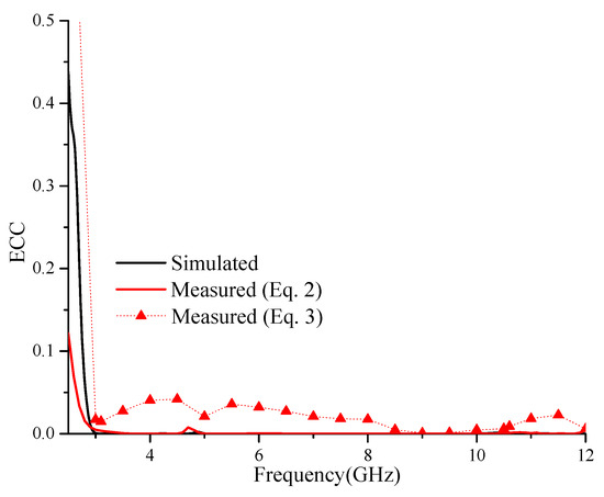 The ECC in this paper is calculated using simulated and measured S parameters with and without consideration of the efficiency. The ECC value, calculated either from simulated or measured S parameters (Equation (2)), is lower than 0.01, as illustrated in Figure 13. The ECC value is also calculated from the measured S parameters and efficiency (Equation (3)). The obtained values, illustrated in Figure 13, are less than 0.05, a result which remains below the limit value of 0.5. These lower ECC values obtained over the entire FFC frequency band meet the good diversity standard for the MIMO system.