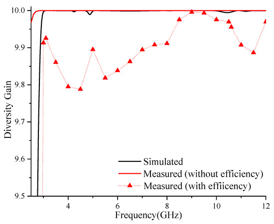 In this study, the resulting simulated and measured diversity gains calculated using the S parameters stand between 9.990 and 10 in the entire frequency band, as shown in Figure 14. However, the resulting measured diversity gains calculated using the S parameters and radiation efficiency stand between 9.8 and 10 in the entire frequency band, due to the consideration of the efficiency.