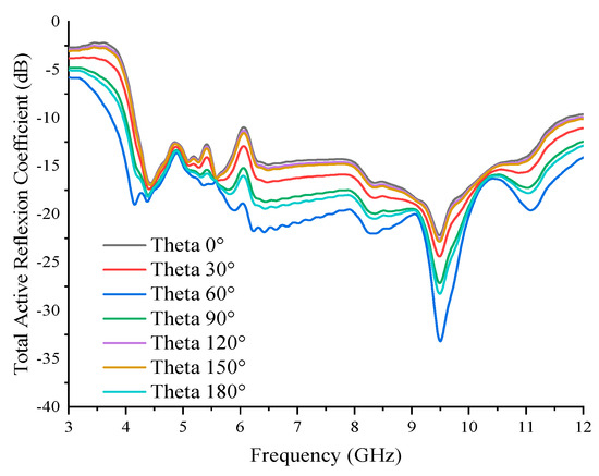 For the random excitation phase (θ), different values of the TARC are obtained. Simulated TARCs for different excitation phases (θ) taken from 0 to 180° with a step of 30° are illustrated in Figure 15.