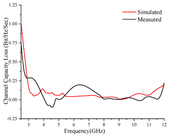 The CCL is another significant diversity performance parameter used to examine the MIMO-antenna performance. For an efficient MIMO-antenna performance, it can be defined as the rate of data reliably transmitted over a specific channel in a fading environment [8,39]. For a better performance, the CCL must be less than 0.4 bits/Hz/s [36,37]. It is calculated using the S parameters using Equations (6)–(8) [36,39,41]: