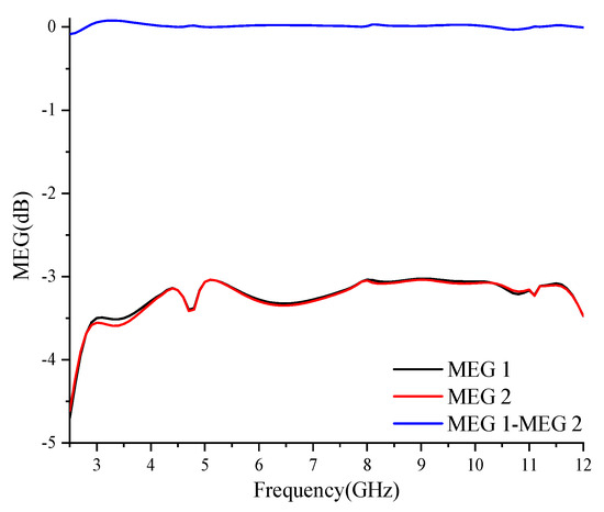 The MEG, which describes the antenna effect in the link budget, is a measure of how much better a MIMO antenna performs than an isotropic antenna. This helps to measure how well the antenna performs in a real environment. It takes into account both the antenna’s gain and the environmental factors that can affect the signal. For a better performance, this ratio must be less than 3 dB [36,37]. It can be calculated using the following two expressions [42]: