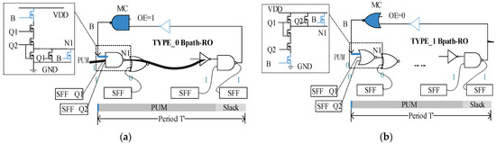 The design of the MC depends on the control type of the first gate of the PUM. The control type of MC in the return loop is the same as that of the first gate in the PUM. For TYPE_0 PUM, it is recommended to use NAND2 as the control structure, as shown in Figure 2a. The two input pins of NAND2 are used as the oscillation enable (OE) (to control the transition between measurement and operation modes) and the return line of the PUM output, respectively. For the first PUM with gate type TYPE_1, NOR2 serves as the control structure. In addition, the MC acts as an inverter in the measurement mode, and the BPath-RO configuration requires an odd number of reversing structures. If the number of reversing units in the PUM is odd, an additional reverser is needed at the end of the PUM on the feedback path.