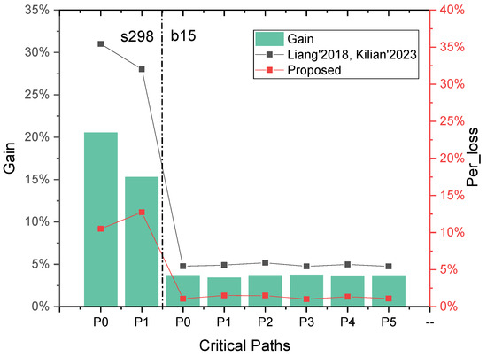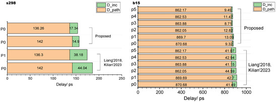 As shown in Figure 6, using the insertion-based measurement method, the incremental path delay caused by building a Path-RO measurement structure for the critical paths {P0, P1} in s298 was 30.1% and 28.02%, with an average of 29.52%, while b15 had an average of 4.89% incremental path delay. Using the BPath-ROs measurements proposed in this paper, the incremental path delays induced by building the measurement structures for {P0, P1} in s298 were 10.49% and 12.72%, with an average of 11.61%, while the average incremental delay for b15 was 1.25%.
