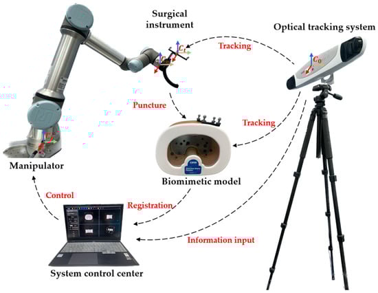The experimental prototype of the RAPP system is illustrated in Figure 1. It comprises several components: a specialized surgical instrument designed to secure the puncture needle; a six-degree-of-freedom (6-DoF) robotic arm (Universal Robots UR5e, Odense, Denmark) with a repeatability of ±0.03 mm for precise puncturing; an optical tracking system (Northern Digital Inc. Polaris Vega ST, Waterloo, ON, Canada) with a maximum refresh rate of 60 Hz, serving as an external measurement device to track the reflective markers; an abdominal biopsy phantom (Sun Nuclea Model 071B, Melbourne, FL, USA); and a system control center based on a workstation (Lenovo ThinkStation K-C2 equipped with Intel i7-12700, 2.10 GHz, and 16 GB RAM). Both the surgical instrument and biopsy phantom are equipped with reflective markers that facilitate their real-time spatial position tracking by the OTS. This tracking capability enables preoperative planning and intraoperative navigation. The surgical instrument is mounted on the flange at the end of the robotic arm and can be precisely guided to the desired puncture location. The system control center communicates with the robotic arm and OTS via TCP/IP protocol and RJ45 interface, respectively.